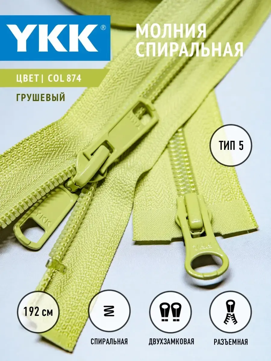 Молния YKK спиральная разъемная двухзамковая, бегунок тип 5, 192 см. Застежка-молния известного японского бренда YKK. Спиральная двухзамковая разъемная молния. Используется в швейной промышленности при изготовлении одежды для взрослых, постельного белья, сумок, декоративных наволочек, различных аксессуаров, спальных мешков, чехлов для машин, чехлов для диванов. Хороший материал для домашнего хобби и творчества в шитье и рукоделии. Молния выполнена из материалов высокого качества. Текстильная лента из нейлона прошла противоусадочную обработку, не линяет при стирке и химической чистке. Звенья у молнии пластиковые, поэтому застежка легкая и бесшумная. Металлический слайдер свободно скользит по текстильной ленте. Цвет звеньев и текстильной ленты молнии совпадают, что делает ее незаметной на изделии. При втачивании не образуют волн. "Маленькая вещь - большая разница".